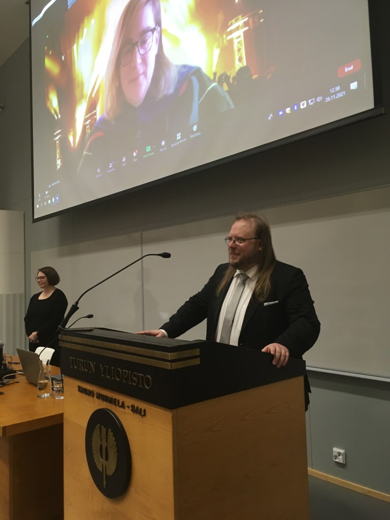 Marraskuussa 2021 kulttuurihistoriasta väitellyt Pekka Kolehmainen: “Itselläni vastaväittäjä liittyi keskusteluun etänä, mutta muutoin järjestettiin normaalein oloin väitös, vaikka tuolla viikolla elettiinkin kiihtymisvaihetta ja päivittäin jännitettiin, josko jokin uusi säädös ehtisi tulla väliin pilaamaan kaiken. Vastaväittäjä heräsi kiitospäivää seuraavana perjantaina Yhdysvaltain itärannikolla joskus kello viiden aikoihin aamulla tehtävään, mistä pitää hänelle nostaa hattua. Siinä kohtaa oltiin jo aika tottuneita etäilyyn (minä ehkä elämäntapanörttinä vielä hieman muita paremmin), eli koko tilanne tuntui ihan luontaiselta. Omalla kohdallanihan kyse ei ollut täysin koronatilanteesta, vaan myös vastaväittäjän aikataulujen johdosta väitös olisi todennäköisesti joko jollekin maanantaille (hrrr, maanantaiväitös) tai keväälle, mikäli sitä lähitilaisuutena olisi haluttu järjestää. Toki siinä kohtaa kun väitöspäivä oli kohdalla ja kiihtymisvaihe käsillä, tilaisuus olisi todennäköisesti muuttunut etämuotoiseksi, oli suunniteltu miten vain. Mutta näin jälkikäteen ajatellen, en jäänyt tilaisuudesta kaipaamaan mitään, ja näin ilmastokriisin aikana olisin pitänyt vähän outonakin, mikäli ihminen olisi lennätetty Yhdysvalloista Suomeen ihan vaan sataprosenttisesti toimimaan minun vastaväittäjänäni. Toimi se näinkin.“
