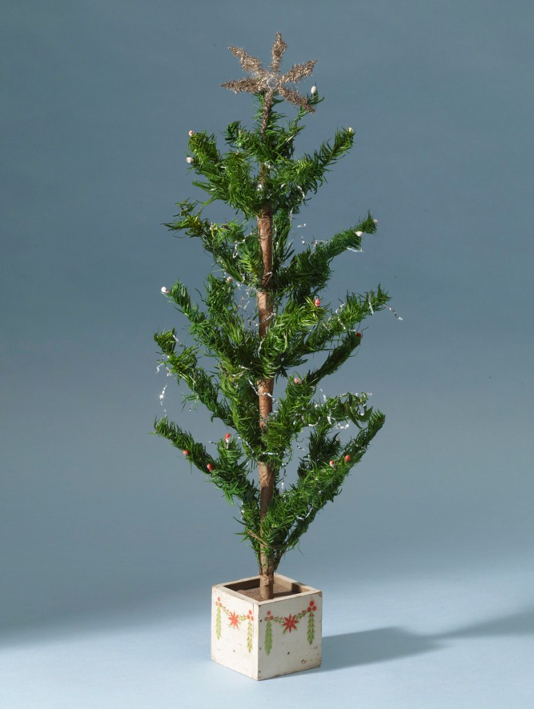 Saksalainen 1940-luvun lopun pöydällä pidettävä tekokuusi, jossa rautalangasta ja vihreiksi värjätyistä linnunsulista tehdyt oksat. Kansatieteelliset kokoelmat, Suomen kansallismuseo. CC BY 4.0.