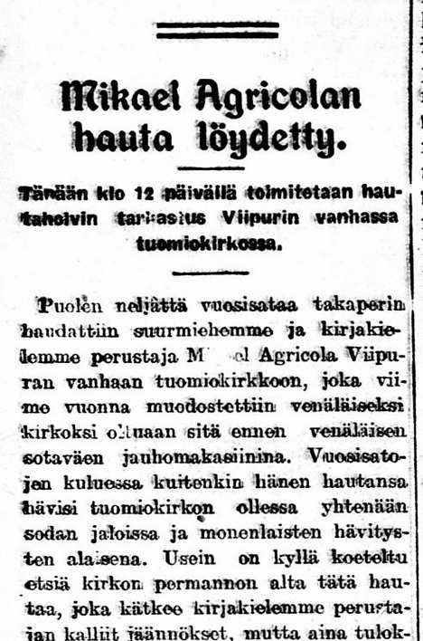 Karjala-lehti uutisoi huhtikuun ensimmäisenä 1914, että pitkään etsitty Mikael Agricolan hauta oli viimein onnistuttu löytämään Viipurin vanhasta tuomiokirkosta. Jutussa valitettiin, ettei kuvia ehditty vielä ottamaan – niitä olisi seuraavan päivän lehdessä – mutta lukijat ja lehtien toimittajat olisivat tervetulleita seuraamaan arkun avaamista klo 12. Onnistuneessa aprillijutussa on sopivasti totta ja tarua. Tässäkin tapauksessa Agricolan haudan oli arveltu olevan jossain päin Viipuria ja mahdollisesti juuri tässä kirkossa, mutta sitä ei ollut onnistuttu löytämään. Uutinen kopioitiin totena ainakin kahteen muuhun lehteen. Jälkihuomautuksena mainittakoon, ettei Agricolan hautaa ole löydetty tähän päivään mennessä.