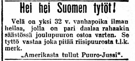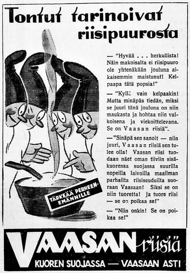 Kirjailija Helga Nuorpuu kuvasi ”Pupujussien jouluiltaa” tarinassaan Turun Sanomissa jouluaattona 1936. Pupuperhe on keskittynyt kuuntelemaan isä-pupun kertomia tarinoita, kun äiti-pupu puolestaan ottaa torkut. Pesäkolon ulkopuolella kuljeskelevat kettu ja susi, jotka himoitsevat jouluruuakseen pupupaistia. Pesäkolossa pupulapset herättävät emonsa ja odottavat puolestaan syötäväkseen jouluherkkuja. Susi ja kettu neuvottelevat pesän ulkopuolella saaliin jaosta, kunnes paikalle saapuu tonttu Tarkkasilmä, joka toruu kaksikkoa pahoista aikeistaan jouluyönä ja saakin nämä luopumaan suunnitelmastaan. Tarinan lopussa korostetaan joulua hyvän tahdon ja rauhan aikana, jolloin kaikilla on hyviä ajatuksia. (Turun Sanomat 24.12.1936.)
