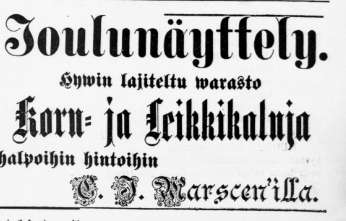 Joulun lähestyessä lehtien sivuilla nostettiin myös esiin paljon kirjallisuutta. Esimerkiksi Akateeminen kirjakauppa mainosti – yleisön toiveesta – pitkällä kirjallisuuslistalla valikoimaansa Uuden Suomettaren (13.12.1900 no 309) etusivulla. Listaukseen oli eritelty suomen- ja ruotsinkielinen kirjallisuus, ja erikseen lasten- ja nuorten teokset, sekä ruotsinkielisistä kotimaiset ja skandinaaviset kirjat. Listauksien aakkosjärjestyksen rikkoo heti ensimmäisenä, hieman isommalla fontilla mainittu J.L. Runebergin Vänrikki Stoolin tarinat, josta oli saatavilla Albert Edelfeltin kuvittama juhlapainos – epäilemättä sen joulun kirjahitti! Suomenkieliseltä listalta löytyy niin kauno-, tieto- kuin hengellistä kirjallisuutta, ja monia tuttuja nimiä, kuten Juhani Aho, Jalmari Hahl, Selma Lagerlöf, Fredrika Runeberg ja Anton Tsehov. Ruotsinkielisen listauksen jako kotimaiseen ja skandinaaviseen hieman mietityttää, sillä skandinaaviselta puolelta löytyy myös brittikirjailijat Jerome K. Jerome ja John Ruskin.