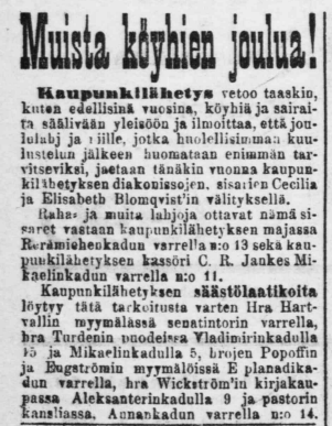 Joulusiivoukseen sai vinkkejä Porissa ilmestyneestä Iltapuhde-lehdestä (13.12.1900 no 49 s. 7): jäätyneet ikkunat sai nimittäin puhtaaksi väkiviinan avulla! Vinkki pistää silmään lehdessä, joka etusivullaan korostaa kannattavansa raittiutta ja tulisi sitä ”teroittamaan sekä suoranaisissa kirjoituksissa että novellien muodoissa”. Kodin osasto -palstalla annettua ikkunanpesuvinkkiä edeltääkin ”keino juoppoutta vastaan”. Keskustelut viinankäytöstä ja raittiudesta ovat erittäin näkyviä kyseisen päivän lehdissä, ja esimerkiksi Perä-Pohjolaisessa julkaistiin teksti viinan vaaroista ja kehotettiinkin kaikkia jättämään jouluksi viinat ostamatta ja käyttämään rahat mieluummin kirjoihin ja sanomalehtiin. (Perä-Pohjolainen 13.12.1900 no 145 s. 3).