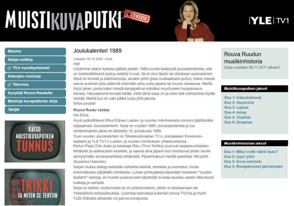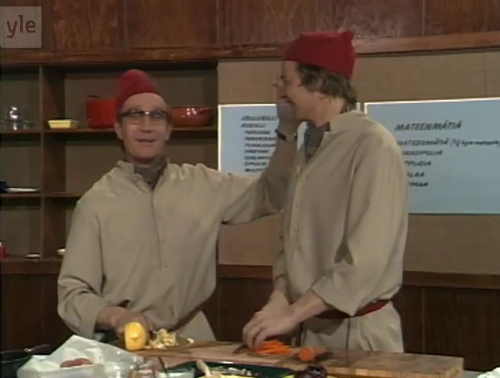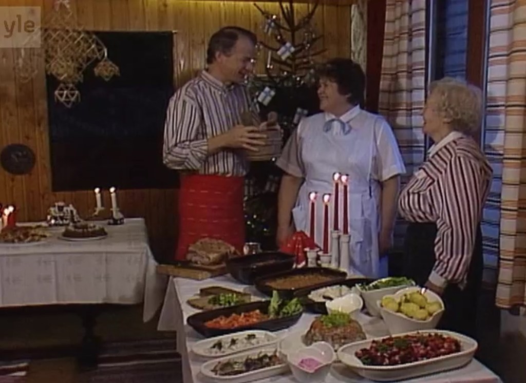 Kulttuurihistorian seuran adventtikalenteri on edennyt jo kolmanteen luukkuun, ja tällä kertaa kurkistamme, millaisena suomalainen joulunvietto näyttäytyy television jouluruokaohjelmien kautta 1970-luvun alusta 1990-luvun alkuun. Kotimaisten kokkiohjelmien ehdottomana pioneerina ja suomalaisen ruokakulttuurin muovaajana voidaan pitää edellä mainittua Patakakkosta, joka ilmestyi 1970-luvun alusta 1990-luvun puoliväliin. Ohjelmaa julkaistiin aluksi nimellä Maukasta mutkattomasti, Asia on pihvi ja Kesäkeittiö, kunnes nimi vuonna 1977 vakiintui Patakakkoseksi. Ohjelman kokit Jaakko Kolmonen (1941–2016) ja Veijo Vanamo (1927–2018) tulivat katsojille tutuiksi kotimaisen ruokakulttuurin ja -perinteiden puolestapuhujina, joiden keskinäiseen dynamiikkaan kuului lämminhenkinen sanailu, terveysvalistusta unohtamatta. Vanamon siirryttyä toisiin tehtäviin Jaakko Kolmosen aisaparina nähtiin Sirkka Gustafsson.