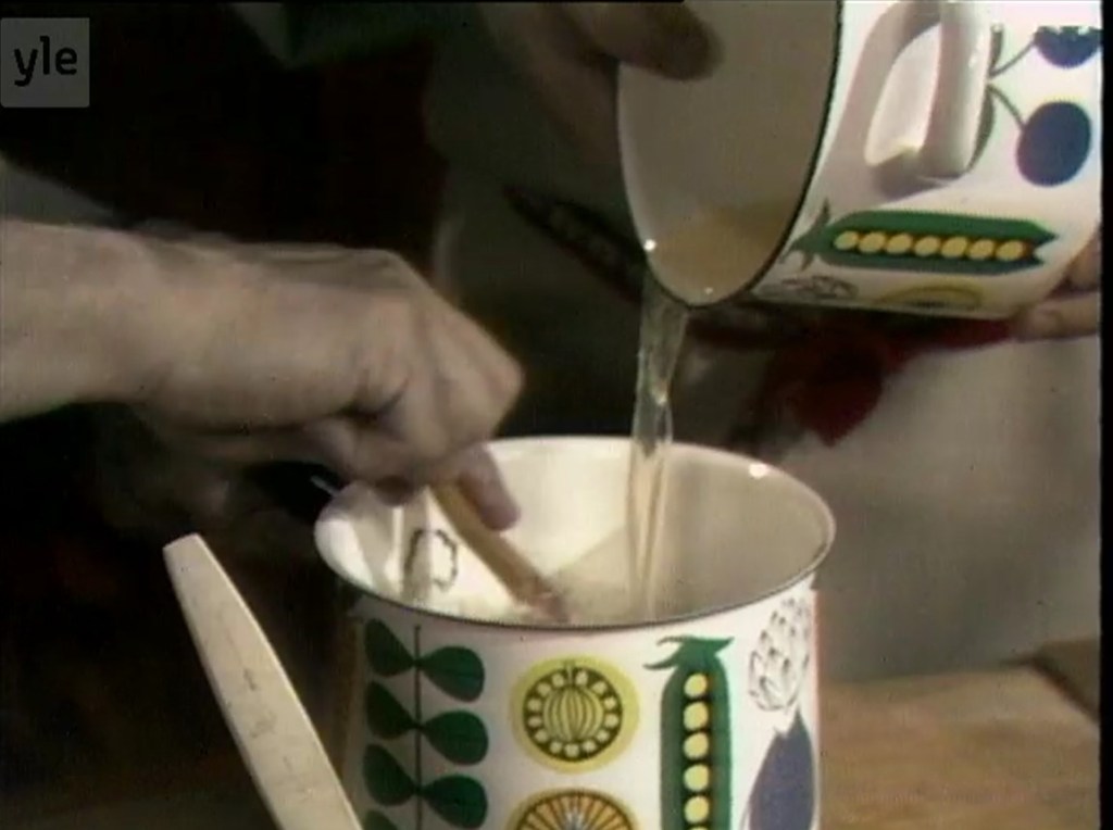 (Asia on pihvi, Perinteelliset jouluruoat 1971.) Joulujaksot ovat nykykatsojasta hidastempoisia, osin toki ihan käytännön syistä, sillä katsojien oli ehdittävä kirjoittamaan mieleisensä reseptit ylös television ruudulta. Maakellarista haettujen juuresten peseminen varpuharjalla pesusoikossa, savusaunan lämmittäminen, hevosen ruokkiminen kauroilla ja taikinankuorella sekä lumilyhtyjen tekeminen pihamaalla näyttävät, miten entisaikojen joulut eivät olleet kiireistä säntäilyä kaupasta toiseen, vaan ne syntyivät – ainakin kullattuina nostalgian kohteina – leppoisasti tekemällä (Perinteelliset jouluruoat 1971). Neliosainen Jouluruokaa -sarja (1972) esittelee lyhyissä kymmenen minuutin pätkissä joulukalenterimaiseen tapaan jouluruokien valmistusta aaton kynnyksellä. Keittiö on varusteltu nykyaikaisesti sähköuuneineen ja -liesineen, ja hehkuvat värit tekevät oikeutta niin ruoille kuin niiden valmistukseen ja tarjoiluun varatuille astioille. Kuvaruutu vilisee suomalaisia design-klassikoita Kaj Franckin Kilta-astioista Timo Sarpanevan punaiseen valurautapataan ja Esteri Tomulan Vegeta-kattilaan.