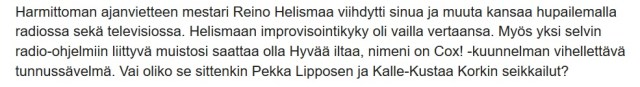 Elokuvan myötä mieleeni nousi välähdyksiä Juicen ja myös Mikko Alatalon keikoilta 80-luvun alun Turussa. Edellinen eli silloin voimiensa päiviä, Juice Leskinen Grand Slam ‑yhtyeen perustamisaikoja. Muistan hyvin senkin, kun Juice tituleerasi itseään ”kielityöläiseksi” Suomen Kuvalehden mielipidepalstalla joskus 70-luvun jälkipuolella. Lehti oli haastatellut ministerinä toiminutta Paavo Väyrystä, jonka puheista se oli nostanut kansilehdelle sitaatin ”Työttömyys on tahdon puutetta”. Lyhyenä kommenttina Väyrysen ajatuksiin ja asenteisiin Juice riimitteli sen muotoon ”Työttömyys on. Tahdon puutetta”. 70-luvun Fingerporia?