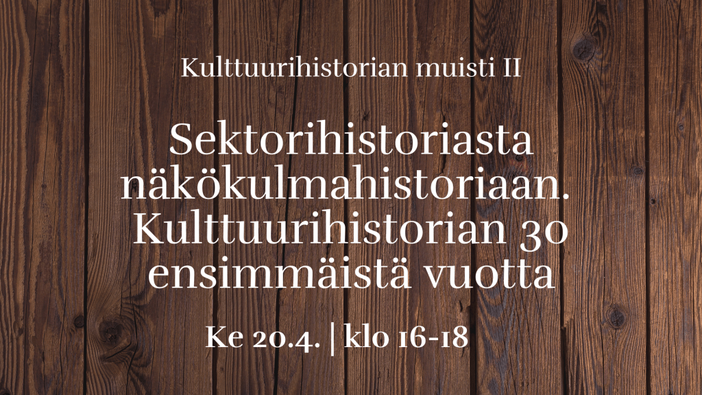 Puhujaksi olemme kutsuneet kulttuurihistorian professori emeritus Kari Immosen, joka muistelee kulttuurihistorian 30 ensimmäistä vuotta otsikolla ”Sektorihistoriasta näkökulmahistoriaan”.